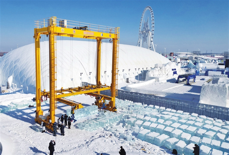 2月3日,一款智能大型冰雕自动化搭建机器人在第二十七届哈尔滨冰雪大世界的科技赋能冰雪实验区进入测试阶段。未来,智能大型冰雕自动化搭建机器人将应用于哈尔滨冰雪大世界的建造,打造“冰雪+科技”融合发展新范本。新华社发 (刘 洋 摄)