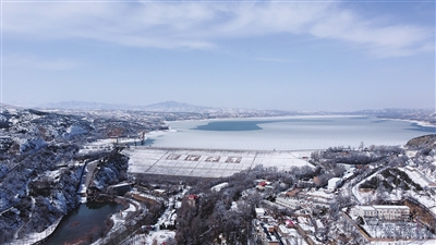 寒冬的第一场飞雪如约而至。巍峨的大坝银装素裹,与山梁、大地、树木、房屋一同融入皑皑的童话世界。