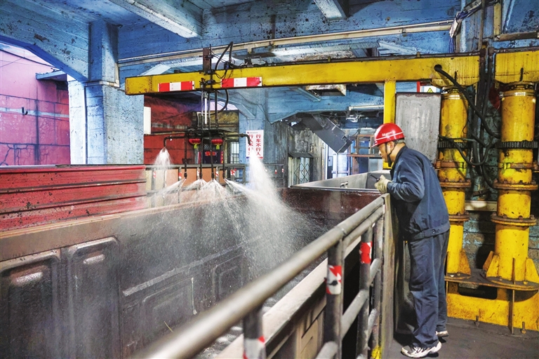 2月3日,山西焦煤西山煤电官地选煤厂,工作人员在向运煤车厢喷洒防冻液,确保煤炭在严寒天气下运输安全、畅通。该厂通过狠抓生产组织、煤质管控与设备维护等关键环节,全力保障节日期间能源稳定供应。王韵菲 摄