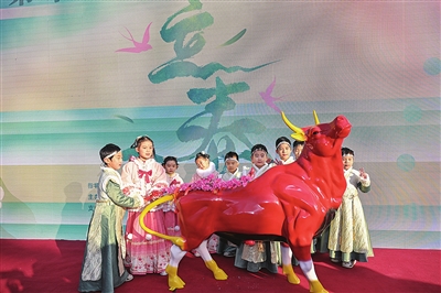 2月4日,“春姑娘”“牛童”手持花枝鞭打春牛。