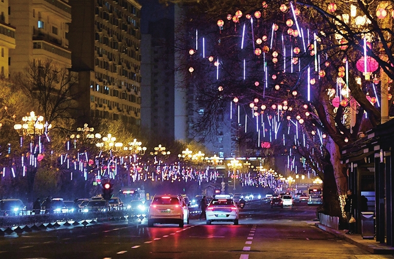 2月4日晚,府东街两侧行道树上装饰的彩灯亮起来,营造出喜庆氛围。邓寅明 摄