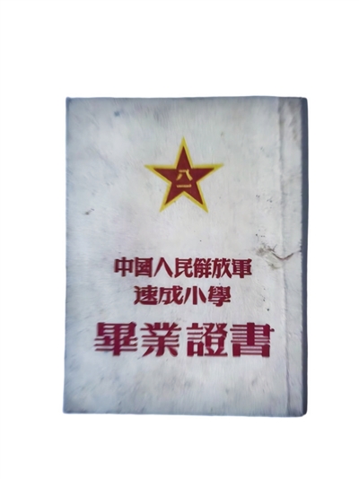 封面上方为八一红星,下面文字为“中国人民解放军速成小学毕业证书”。内文第一页是方形大红印章及证书编号,第二、三、四页为毕业证书内容,第五页为本人相片,第六页是学习成绩表,共列语文、算术、自然常识、政治、军事5门课程和操行成绩。