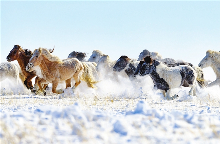 2月5日,马群在凤凰马场的雪原上奔驰。