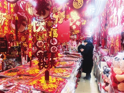 侯素萍一边麻利地给下一位顾客打包,一边指着货架上一款设计独特的春联介绍道:“你看这副,上下联的文字排列和大小都不规则,打破了传统样式,看起来既喜庆又时尚。这些新颖的年货吸引得年纪大的人爱逛,年轻人也来得多。”记者在摊位前停留的十几分钟里,前来批发的商户和散客络绎不绝,侯素萍手上的活计一直没停过。