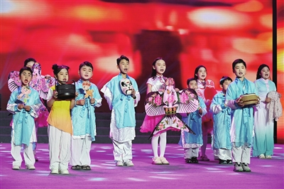 2月8日,在河南省沁阳市朱载堉音乐厅,小朋友们在“少儿春晚”上表演集体诗朗诵《非遗里的中国》。新华社发 (杨 帆 摄)