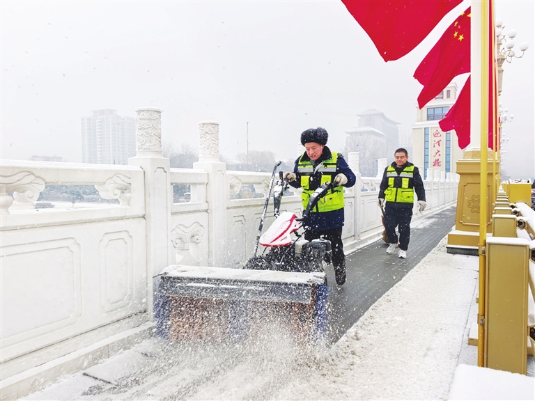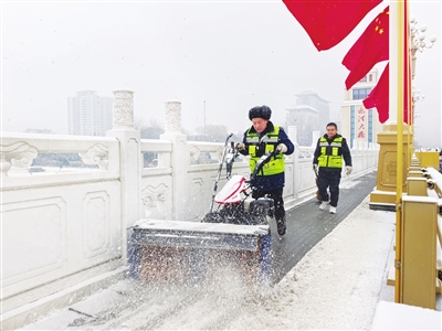 2月9日,我市迎来降雪,城管部门及时开展清雪除冰工作,保障道路畅通。图为市市政公共设施建设管理中心道排保障一所工作人员在迎泽大桥人行便道上清雪。牛利敏 摄