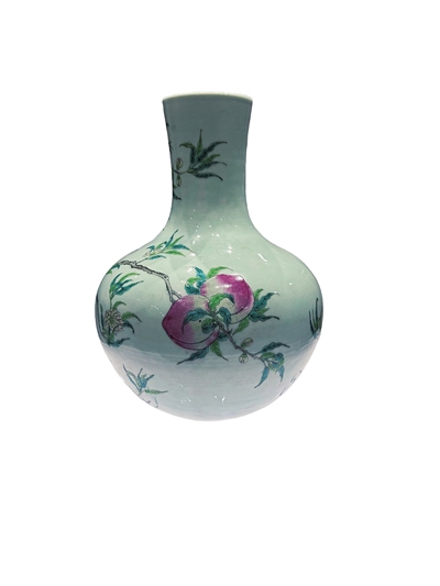 粉彩创烧于清康熙晚期,成熟于雍正、乾隆两代。其特色是柔和细腻,与五彩的强烈光彩不同,故称“软彩”。天球瓶造型始于明永乐,古人认为“天圆地方”,因其腹部浑圆似天而得名。清代中期,粉彩桃纹天球瓶有“雍八乾九”之说——雍正时期多绘八桃,乾隆时期则绘九桃。“九”为至尊之数,九桃寓意“多子多孙,多福多寿”。