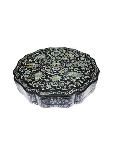 此盒木胎,菱花形,子母口,直腹,平底。通体髹黑漆,镶嵌螺钿。盖面中心饰“双鱼磬”,四周环饰八宝纹,顺时针方向依次为莲花、宝瓶、双鱼、华盖、法轮、宝伞、盘长结、法螺。盖面边沿以近百个如意云头组成雅致边饰。盒内套九枚小盒,用于储物。整体造型华贵端庄,黑漆莹润透亮,螺钿斑斓耀目。