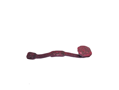 如意原为搔杖,后成祥瑞象征。展品清代雕漆人物故事如意,为“三镶式”变体,整体以漆木为材,虽在首、腹、尾三处各留镶嵌位置,却未嵌玉,而以剔红工艺代之,于每处各雕一幅人物故事图,柄身其余部位则遍刻莲蝠纹。朱漆明丽鲜亮,刻工细腻精湛。
