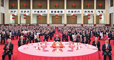 人民大会堂宴会厅灯光璀璨、喜气洋洋,各界人士2000多人欢聚一堂、共迎佳节,现场洋溢着欢乐祥和的节日气氛。