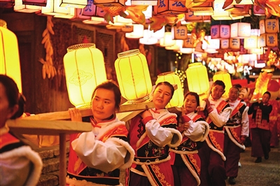 二月十七日,表演者在贵州省遵义市乌江寨景区进行板凳龙巡游表演。