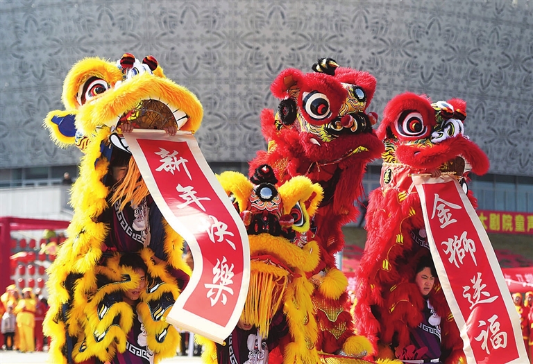2月18日,民间艺人在江苏省淮安市金湖县文化艺术广场表演舞狮。