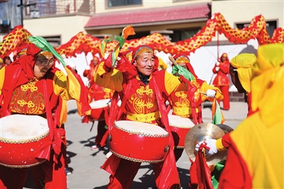 2月18日,在甘肃省酒泉市肃州区下河清镇紫金村,紫金村社火队表演太平鼓。