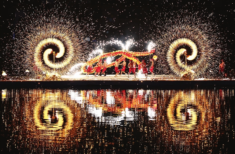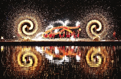2月17日,民间艺人在湖北省襄阳市华侨城奇幻谷景区表演“火龙钢花”。