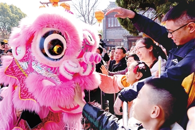 2月20日,在山东省枣庄市台儿庄古城举办的新春大庙会上,游客与舞狮互动。新华社发