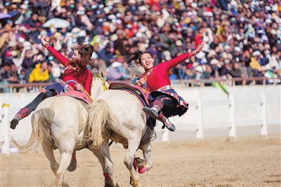 2月20日,马术队员在表演马上技巧。2月20日是马年大年初四,藏历火马年大年初三,拉萨市北郊赛马场举行了民族传统马术表演暨民族赛马活动。马术队员策马扬鞭,一展技艺,以精彩的马术表演献礼马年新春。新华社记者 丁增尼达 摄