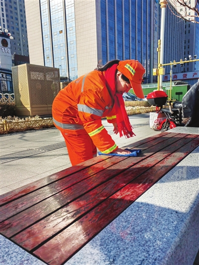 普扫完成后,赵对花拿出抹布,开始仔细擦拭路边的座椅、阻路桩和灯杆基座这些“城市家具”。“迎泽大街是‘三晋第一街’,档次高,要求也高。既然干了这行,就得做好。”赵对花说,“来应聘时,队里把要求和待遇都说得明明白白,咱不能干糊弄人的事儿。”