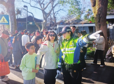 “绿灯行人请快速通行”“附近停车位紧张,可以考虑通过公共交通换乘到达”……在断桥与北山路交叉口,杭州市公安局交管支队景区大队灵隐中队民警李雨杭与同事指挥着行人和车辆,忙碌而从容。
