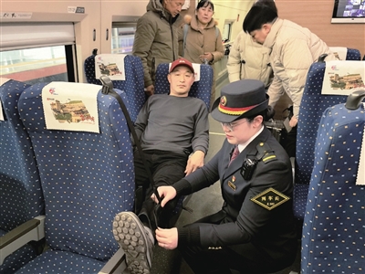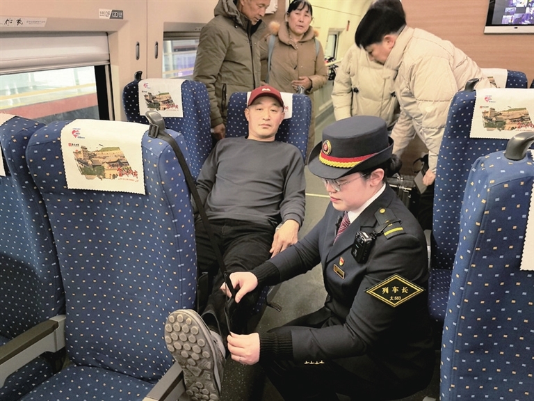 春运期间,国铁太原局推出“暖途随行宝”,准备了护颈枕、腰靠、腿托等物品,让特殊旅客感受到旅途中的温情。图为2月26日,国铁太原局G682次列车(长治东一北京丰台)上,列车长许真为旅客提供服务。王韵菲 张杨青 摄影报道