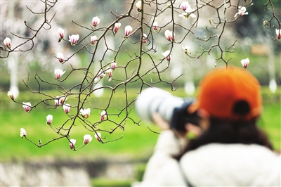 2月25日,游客在江苏省南京市雨花台风景区拍摄宝华玉兰。春意渐浓,各地美景吸引人们外出游玩赏景,尽享春日好时光。新华社发 (孙忠南 摄)