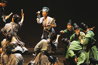 于是舞台上出现了第四个篇章“承光阴”,舞者化身从永乐宫原址跑向芮城城外魏国古遗址的人群,这些人群,搬斗拱、画图纸、切割壁画,用尽自己的才思。他们是永乐宫的功臣,但他们除了像柴泽俊这样的大家外,大多寂寂无名。这样的人群最后以舞者群像在舞台上定格,加深和提升了剧的故事性。本来,舞蹈长于艺术抒情,而不擅长叙事,但有了这个篇章,观众在建筑师的日志中,找到了剧的线索、情节,恍然大悟——这是一个故事。原来,“承光阴”是花萼,托起“筑广厦”“绘至境”“炼釉心”这三个花瓣,一朵诗舞之花便栩栩如生地开放在剧场里了。