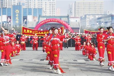 活动在“社火闹春”篇章中拉开帷幕。祥狮献瑞、秧歌锣鼓、清徐背棍、二鬼摔跤、高跷旱船等传统社火项目悉数登场,郝庄经济联合社的表演队伍以舞龙、空竹等节目引得观众连连叫好,现场掌声不断。在“春归迎泽”篇章中,杨氏太极拳表演、秧歌庆元宵、小花戏双扇等节目轮番上演。在“福泽万家”篇章中,来自迎泽街道、文庙街道等单位的表演团队带来《开门红》《张灯结彩》《盛世欢歌庆元宵》等节目,展现了社区居民积极向上、热爱生活的精神风貌。来自山西省吉林商会扶残助残委员会的《千手观音与川剧变脸》节目,融合了传统艺术与公益情怀,感动了现场观众。