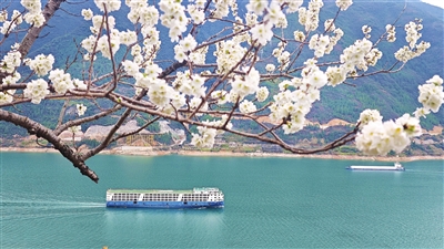 3月2日,船只航行在春花映衬下的重庆市巫山县长江巫峡水域。