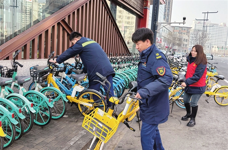 3月5日,迎泽区解放南路一社区联合中铁电气化局太原中铁轨道公司共同开展学雷锋主题活动。图为志愿者们在大南门路口及地铁站周边整理共享单车。牛利敏 苏丹丹 摄影报道