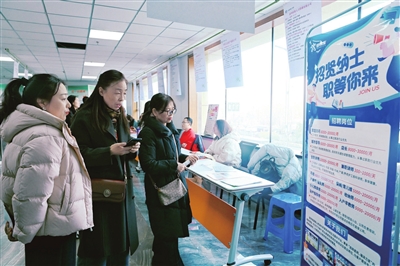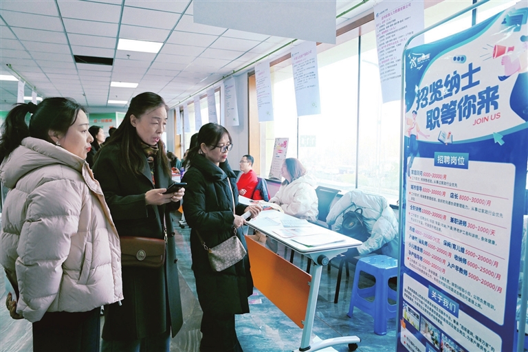 3月9日,小店区妇联和小店区人社局联合举办“赋能发展·促进就业”招聘会,28家企业提供80多个岗位。图为招聘者在浏览招聘信息。郭苑甫 摄