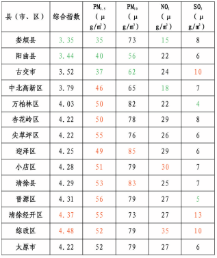 1.综合指数、PM10、NO2和SO2指标排名前两位的标为绿色,排名后两位的标为红色;