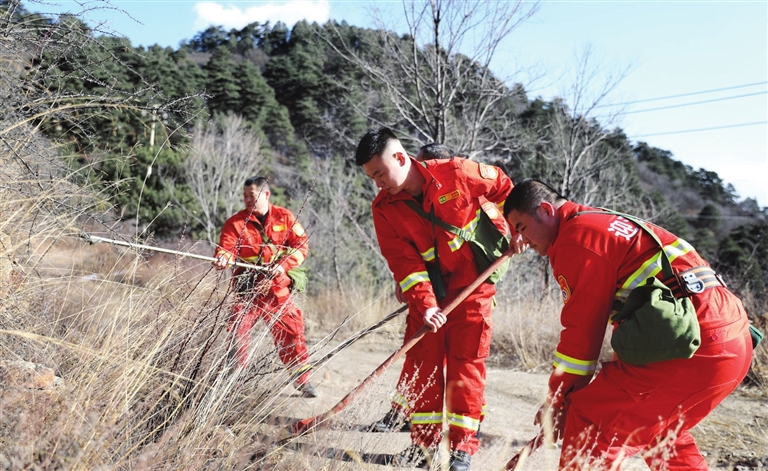 春季是森林草原火灾高发期。迎泽区森林防灭火大队加大宣传力度和野外巡查力度,全力守护人民群众生命财产安全。图为3月10日,队员们在张家河村大河滩沟重点火险点位清理枯草。郭苑甫 摄