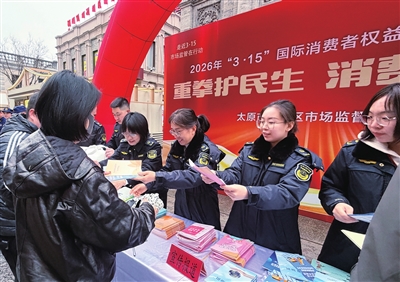 3月13日,迎泽区市场监督管理局在钟楼街开展“重拳护民生 消费享安心——走近3·15 市场监管在行动”主题宣传活动。图为工作人员向群众发放宣传资料。张昊宇 张慧媛 摄影报道