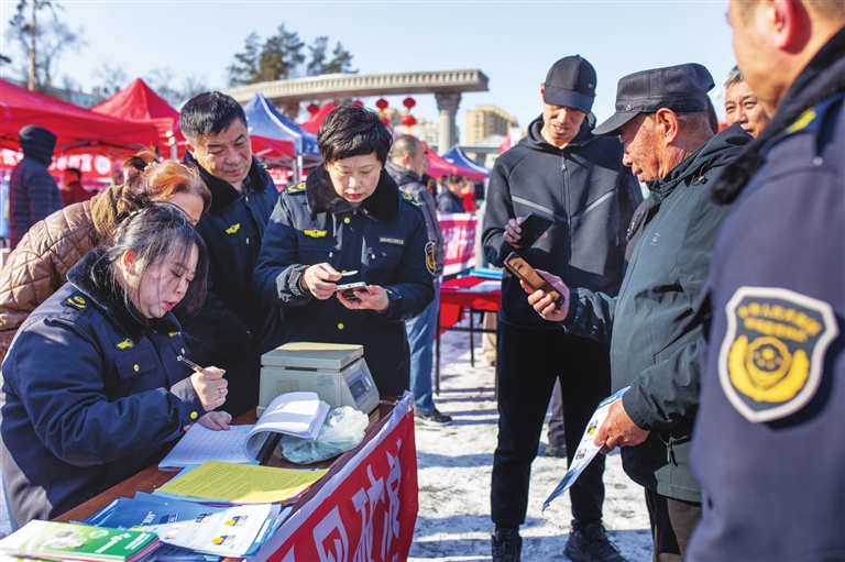❶3月15日,在黑龙江省富锦市,市场监督管理局工作人员免费为市民测量手机重量并发放重量标贴,引导群众用手机作为砝码检测秤的准度,防止“鬼秤”欺客。