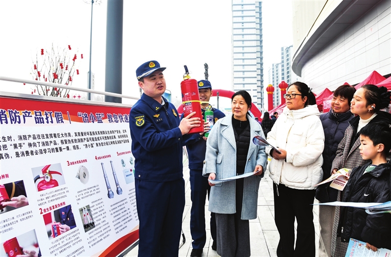 ❷3月15日,工作人员在河南省济源市消费者权益日主题活动现场为消费者介绍如何鉴别假冒伪劣消防产品。
