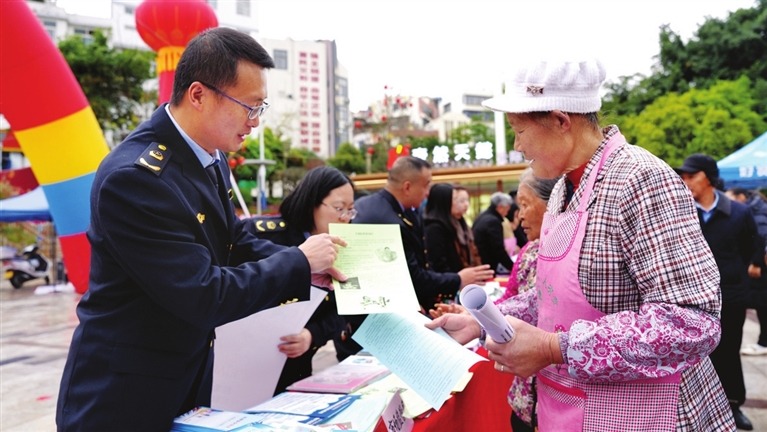 ❸3月15日,在云南省昭通市永善县工农广场,工作人员向市民宣传消费者权益保护知识。 新华社发