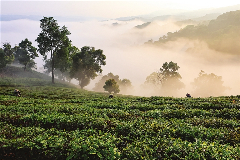 3月15日,云南省西双版纳州勐海县勐混镇曼蚌村茶农在采摘春茶。