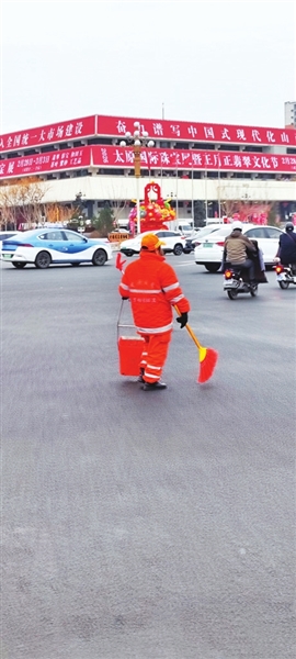 迎泽大桥就在她的前方,红旗一排排迎风招展,橙红色的身影与清晨的天空形成鲜明对比。迎泽大桥桥身整洁,路面平整,背后都是这样一群人的辛苦付出。城市的市容越来越漂亮,基础设施越来越完善,我们习以为常的整洁街道,其实是他们日复一日的坚持换来的。