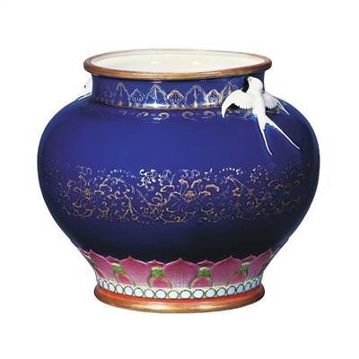 说起燕子,便想起一件稀世之珍——清乾隆霁青釉金彩海晏河清尊。此尊为景德镇御窑所制,原陈设于圆明园海晏堂。敞口短颈,丰肩鼓腹,肩颈之间雕贴一对白色展翅剪尾燕子为耳。霁青釉色,深沉如河;金彩绘就蕉叶缠枝,富丽而不失雅致。最妙是那对燕耳,振翅欲飞,恰应“玄鸟至”之候。