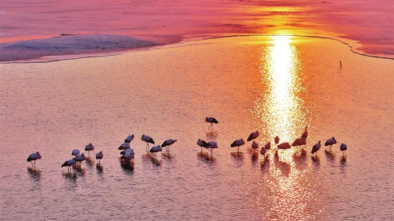 3月19日,东方白鹳在松花江哈尔滨段一处水域栖息、觅食(无人机照片)。