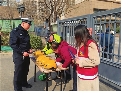 每天早上高峰期,由执勤民警、社区网格员、保安、物业组成的联合劝导队伍都会出现在社区主出入口。这不再是单一的执法,而是一场“柔性劝导+便民服务”的暖心行动。对于未佩戴头盔的居民,民警讲法规、说案例,网格员则以“拉家常”的方式化解抵触情绪;针对确有急事的居民,社区门口设立的“头盔临时借用点”解了燃眉之急,登记信息即可免费借用,实现了管理与服务的并重。