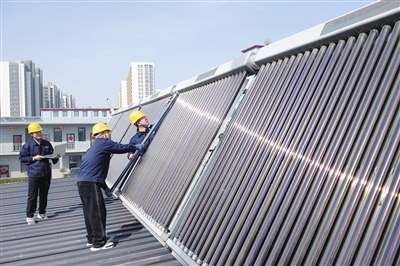 3月25日,山西科大云宏科技有限公司产品展示区内,工作人员在安装调试大口径大串联“玻璃—金属”管式太阳能集热器。该公司坚持自主研发,深耕太阳能集热、光伏发电、空气源热泵等领域,系统集成技术和产品已处于国际领先水平。牛利敏 摄