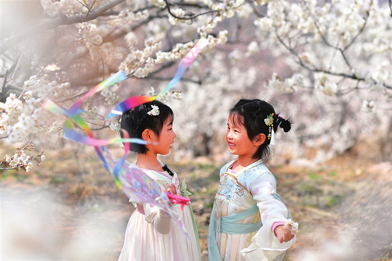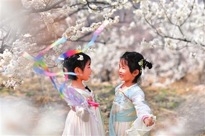 3月24日,在山东省青岛市城阳区夏庄街道,小朋友在花间游玩。新华社发 (王海滨 摄)