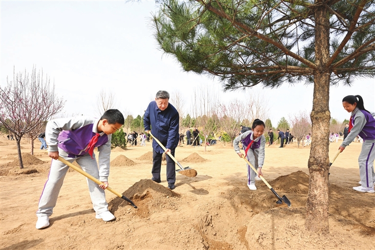 挥锹铲土、培土围堰、提水浇灌……习近平接连种下油松、北京牡丹、榆叶梅、杜仲、元宝枫等多棵树苗。他一边植树,一边询问孩子们的学习生活、劳动锻炼和参加植树情况。习近平强调,青少年像小树苗一样充满活力和希望,要从小树立远大志向,爱知识、爱劳动、爱自然,德智体美劳全面发展,努力成长为栋梁之材。现场气氛热烈,一派繁忙景象。
