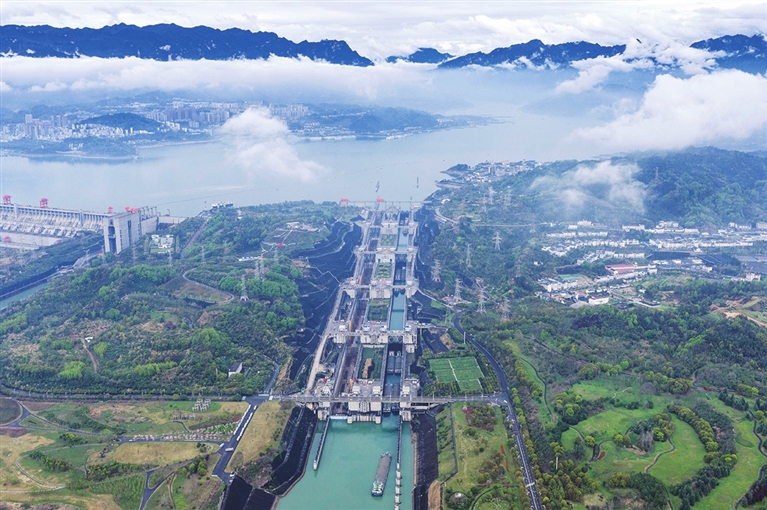 3月30日,湖北宜昌,三峡枢纽南线船闸正加紧检修,北线船闸有序通航(无人机照片)。