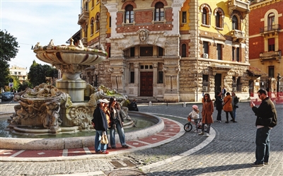 3月29日,人们在意大利首都罗马的明乔广场合影。意大利首都罗马近日气温回暖,春意渐浓,人们纷纷走出家门,乐享周末。新华社记者 王楷焱 摄