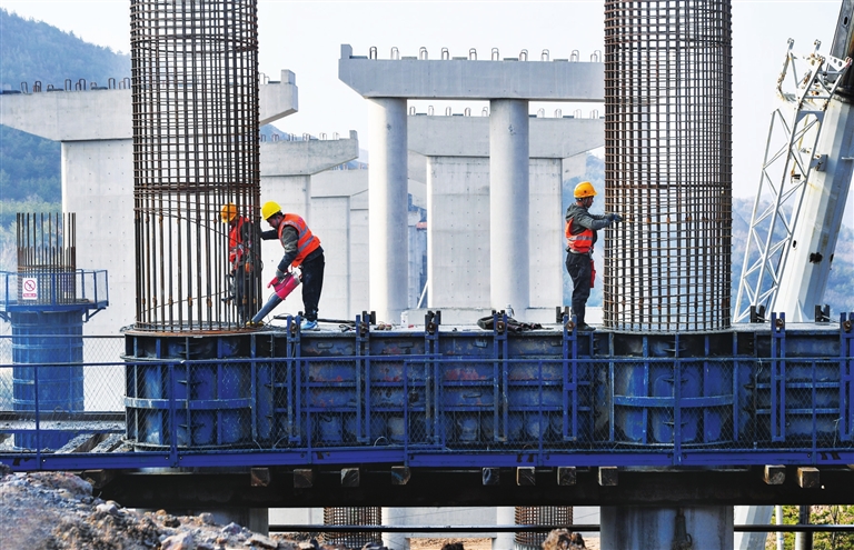 3月31日,青银二广高速公路太原联络线项目迎泽区董家庄附近,施工人员在进行高架桥墩的作业。目前,该项目东山2号隧道左、右双洞顺利贯通,东山3号隧道正在快速推进中。项目建成后将成为太原通往阳泉、石家庄更为便捷的通道。牛利敏 摄