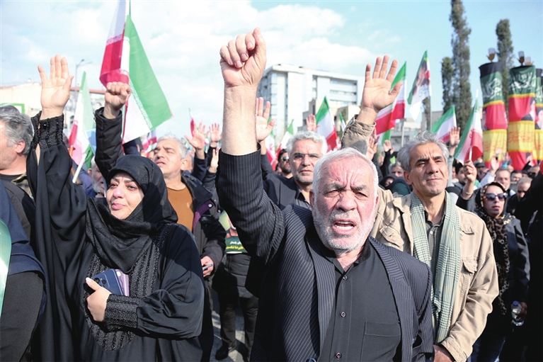 15时许,新华社记者在现场看到,大批民众聚集在德黑兰革命广场,挥舞着伊朗国旗,手持已故伊朗最高领袖阿里·哈梅内伊和坦格西里的画像,以及现任最高领袖穆杰塔巴·哈梅内伊的照片,高呼反对美国和以色列的口号。