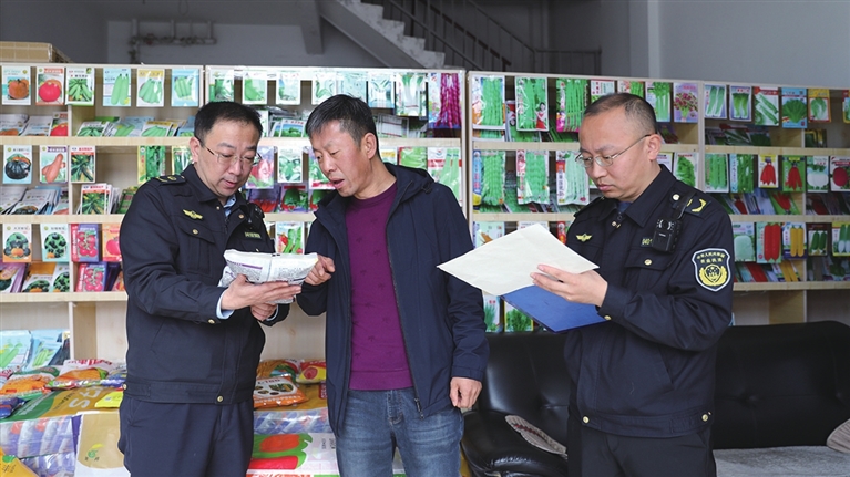 4月1日,太原市农业农村局执法人员在山西万水农资市场开展“农资打假”专项执法检查和随机抽样工作,为全市春耕生产保驾护航。郭苑甫 摄