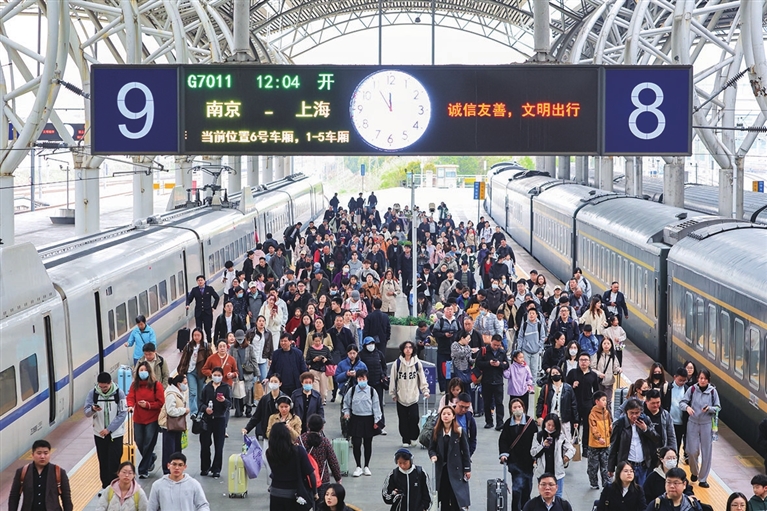 4月3日,抵达南京站的旅客准备出站。记者从中国国家铁路集团有限公司获悉,为期5天的铁路清明假期运输3日启动,自4月3日至4月7日,全国铁路预计发送旅客9050万人次,日均发送旅客1810万人次,4月4日为客流最高峰日,预计发送旅客2120万人次。新华社发(苏 阳 摄)