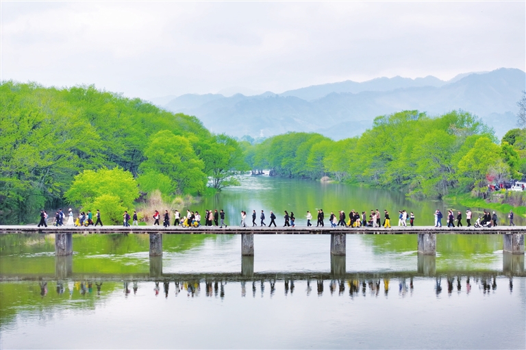 4月4日,游客在安徽省黄山市徽州区西溪南湿地踏青游玩(无人机照片)。